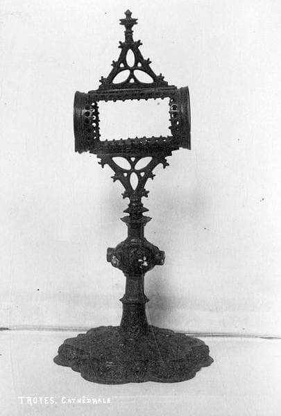 Reliquaire cylindrique pédiculé. Fait de trois pièces.£Sur la tige, noeud orné de 6 émaux peints.