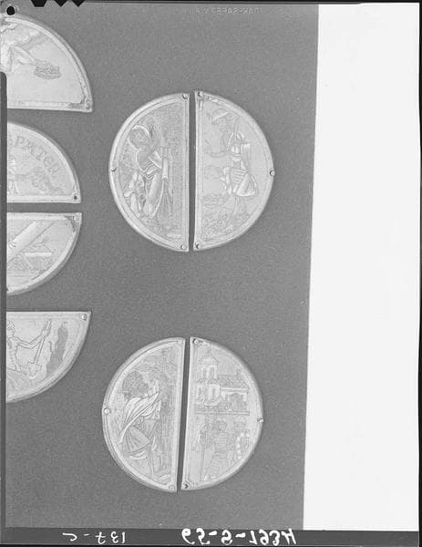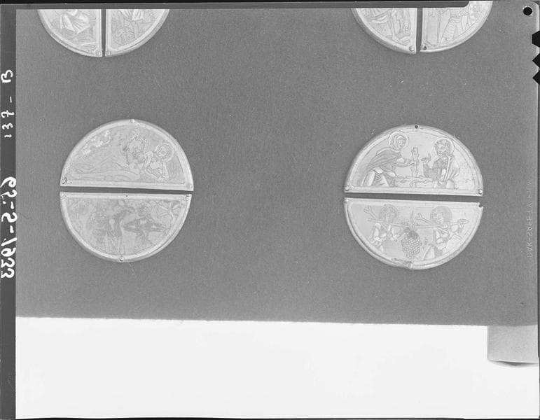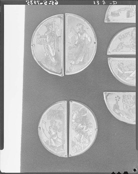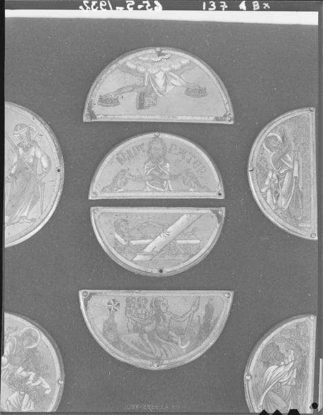 19 plaques semi-circulaires et une plaque semi-ovalisée.£Sur 18 plaques, les personnages à vêtements émaillés se détachent sur un fond de cuivre doré. Sur les deux autres, les personnages sont réservés et gravés sur un fond émaillé.£Emaux rhénans.