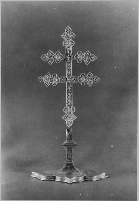 A double traverse, filigranées. Décor et figures sur les deux faces latérales. Les six extrémités sont tréflées et précédées, à l'avers, de quadrilobes vitrés, à fond de velours rouge, renfermant des parcelles de reliques dont les noms sont inscrits en lettres gothiques.