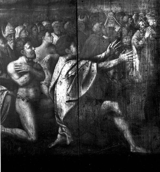POP | Plateforme ouverte du patrimoineDeux volets de triptyque : Volet droit : La Miséricorde, la Vérité et la Justice surplombant une foule de personnages (face) ; Vierge de l'Annonciation (revers en grisaille) et volet gauche : La Foi, l'Espérance et la Charité surplombant une foule de personnages (face) ; Ange de l'Annonciation (revers en grisaille)