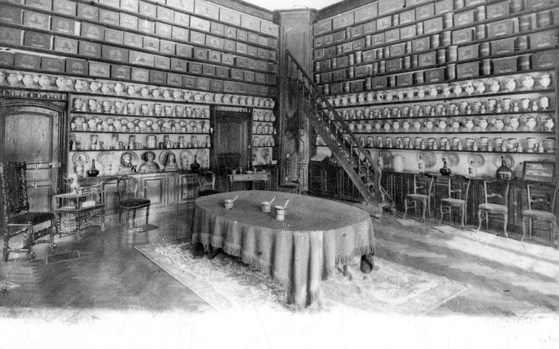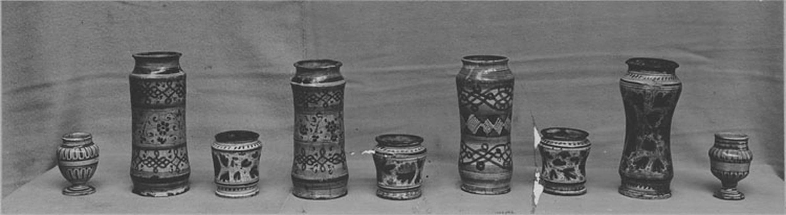 Collection composée de 17 piluliers, 115 chevrettes, 118 pots-canon, 8 grands pots cylindriques et 10 bouteilles.£Décor bleu au grand feu. Certains ont des inscriptions en latin désignant leur contenu.