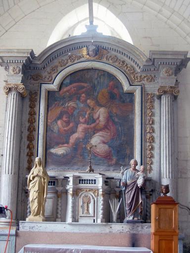 Retable du maître-autel et sa toile : la Vierge et l´Enfant avec Ste Elisabeth et saint Jean-Baptiste, tabernacle de bois sculpté, 18e siècle, 06-05-1982.