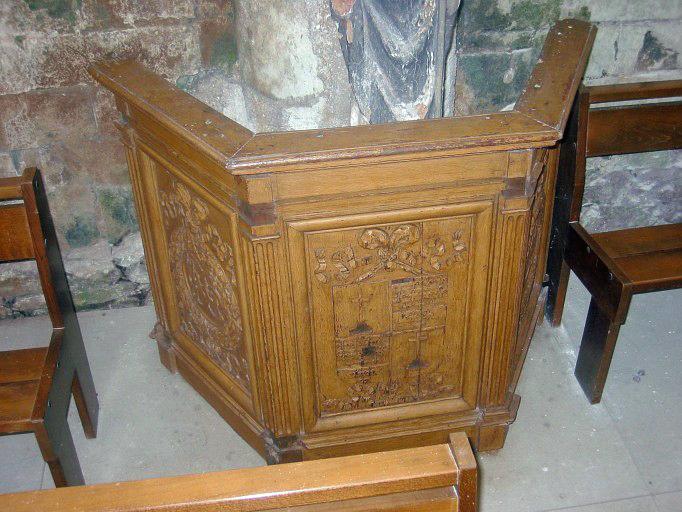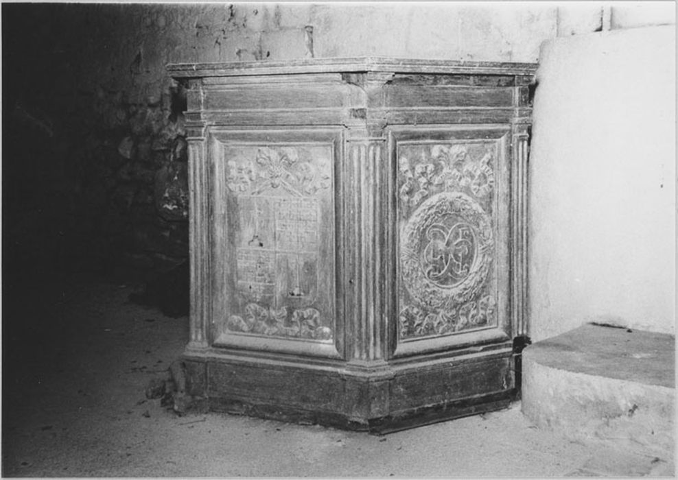 Cuve de la chaire à prêcher avec armoiries, bois sculpté, 17e siècle, 06-05-1982.
