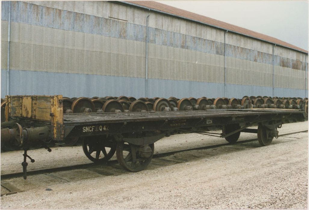 Extrémités du plateau (ridelles) relevables et verrouillables. Au niveau tendeur : bringueballe (manille) en forme de boule à une extrémité et à l'autre, une boule tronquée à PLH. Grenaillage et peinturage d'origine. Essieux à toile pleine et roues à rayons (2). Tampons type unifiés pas d'origine. Tare : 8, 620 tonnes.