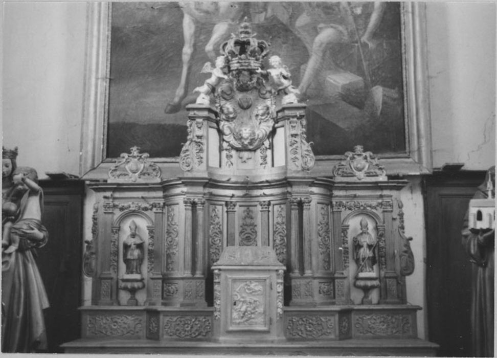 Maître-autel, tabernacle, retable et son exposition, statuettes de saint Nicolas et de saint Martin, bois sculpté, 18e siècle, 12-01-1977.