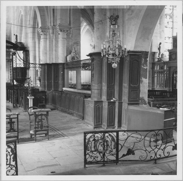 Ensemble constitué par le maître-autel et son tabernacle, les boiseries du choeur et de l'avant-choeur, deux consoles et l'appui de communion, marbre, bois sculpté et fer forgé, début du 18e siècle, 27-07-1959.