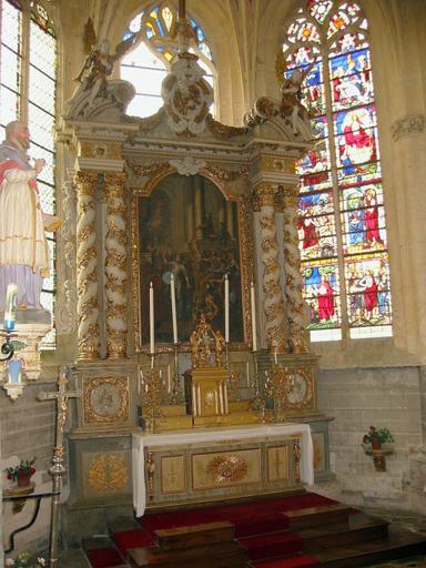Retable du maître-autel, avec toile : Saint Georges devant les idoles par Chabouillet, + 1684, bois sculpté doré et polychrome, 17e siècle, 12-02-1960.