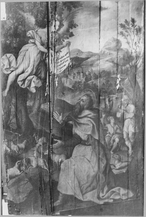 Panneau peint dit panneaux Fliche : Vision de saint Joachim, saint Jean-Baptiste (grisaille)
