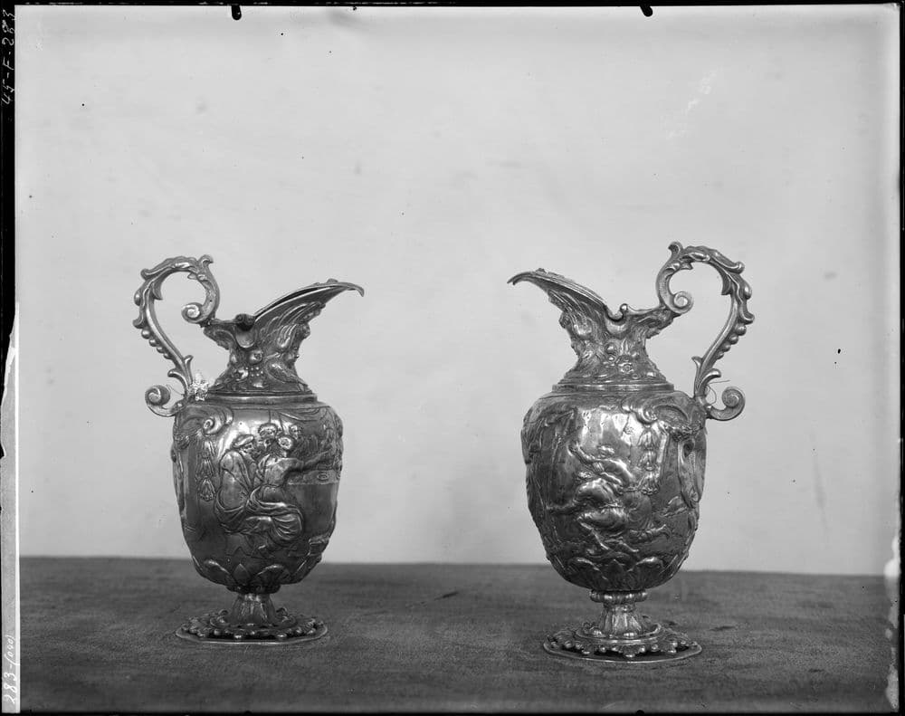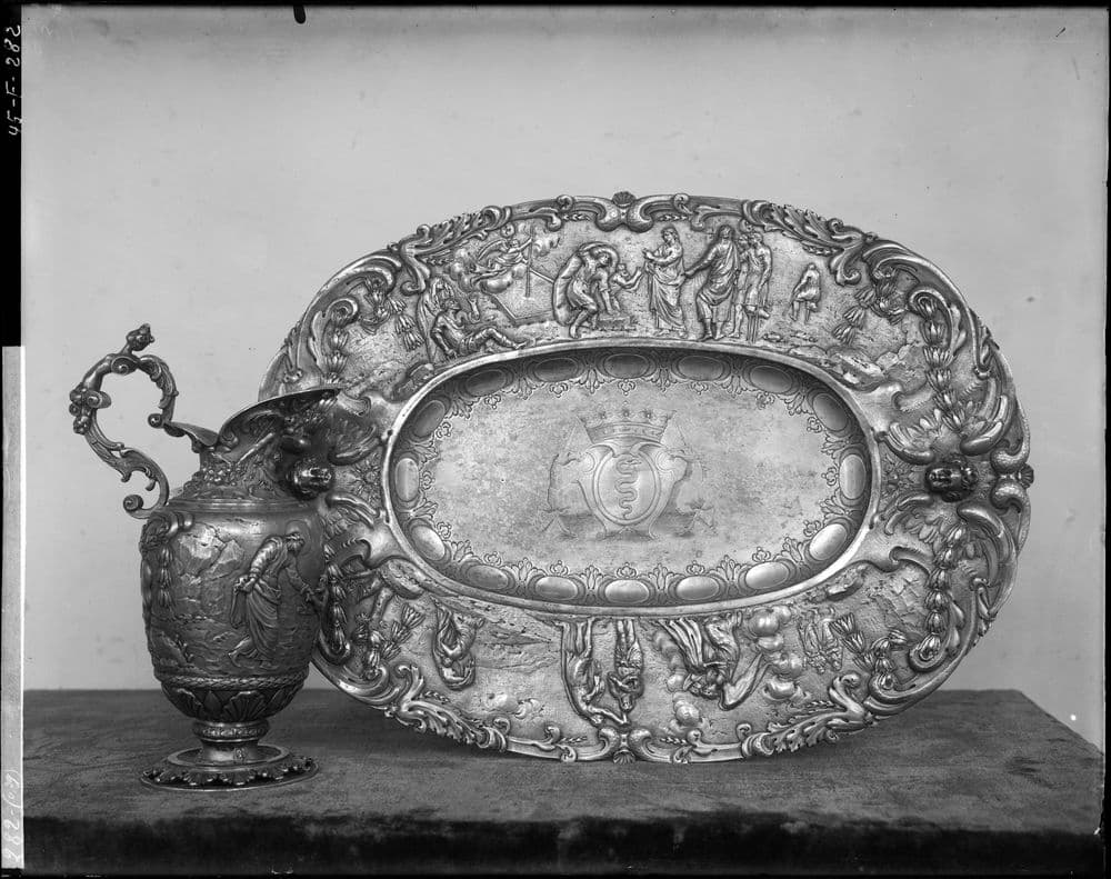 POP | Plateforme ouverte du patrimoine2 burettes et plateau à burettes aux armes d'Edouard Colbert : Moïse et l'eau du rocher, Noces de Cana, Jésus et la Samaritaine, Lavement des pieds