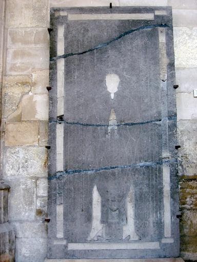 Calcaire noir de type pierre de Tournai. A effigie gravée. Incrustations (visages, inscription externe, registre inférieur du vêtement) en marbre blanc uni.