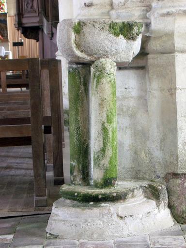 Le bénitier est posé sur deux colonnettes et une base moulurée réemployées.