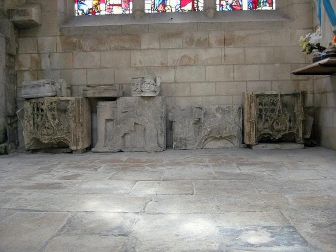 2 sommets de dais, 2 fragment de chapiteaux, 1 base de colonne, deux fragments.