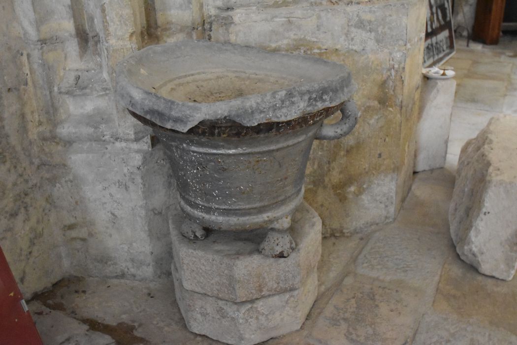 Bénitier (2) en forme de cloche, fonte de fer, 16e siècle.