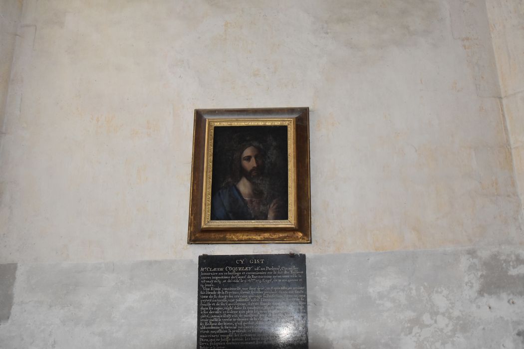 Transcription (partielle) : CY GIST / MAISTRE CLAUDE COQUELEY ADVOCAT AU PARLEMENT CONSEILLER / HONORAIRE EN CE BAILLAGE ET COMMISSAIRE SUR LE FAIT DES TAILLES ET / AUTRES IMPOSITIONS DU COMTE DE BAR SUR SEINE NE EN CETTE VILLE LE / 26 MAY 1654 ET DECEDE LE 9 OCTOBRE 1745 AGE DE 91 ANS 4 MOIS ET 14 JOURS [...].£CY GIST AUSSY / MAITRE DENIS GENEVIEVE COQUELEY SEIGNEUR DE CHAUSSEPIERRE / LIEUTENANT GENERAL CIVIL ET CRIMINEL ET COMISSAIRE ENQUESTEUR EXA/MINATEUR AU BAILLAGE DE BAR SUR SEINE [...] IL MOURUT LE 11 AVRIL 1749 [...].