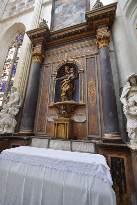 Retable, bois sculpté du 18e siècle et 19e siècle, avec statue bois Vierge à l'Enfant et toile Descente de Croix.