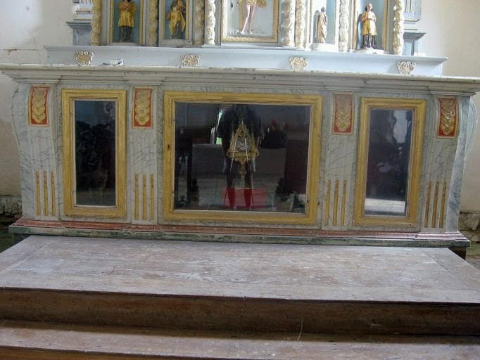 Autel à reliques. Autel à 3 baies vitrées en façade. Reliquaire de saint Vincent de Padoue et de saint Vincent de Paule.