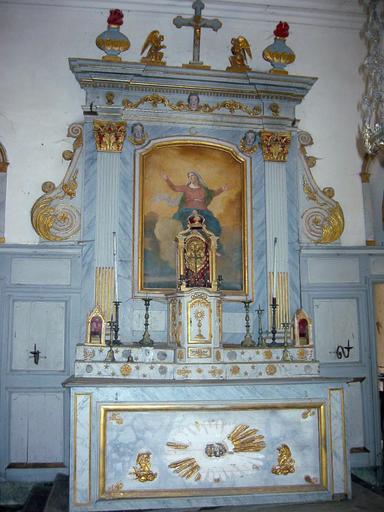 Retable du maître-autel, tabernacle et exposition, bois peint et doré avec toile l'Assomption, 18e siècle.