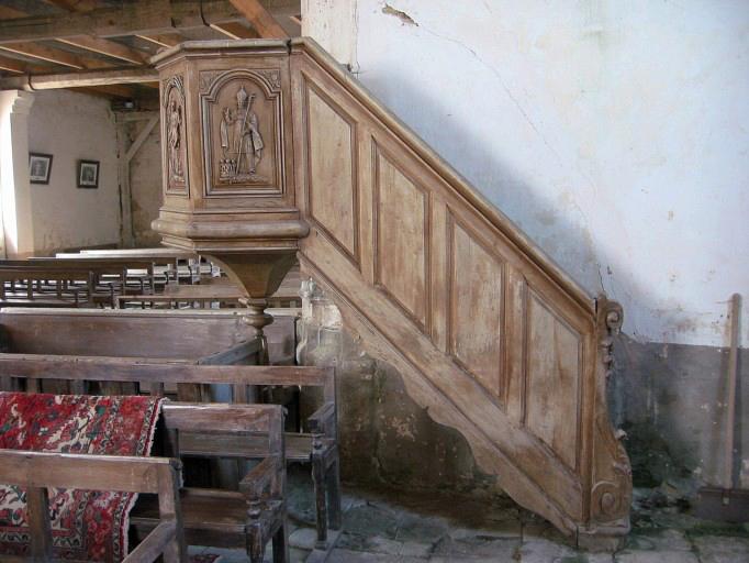 Chaire, trois panneaux : le Christ, saint Nicolas, saint Antoine, bois sculpté, 17e siècle.