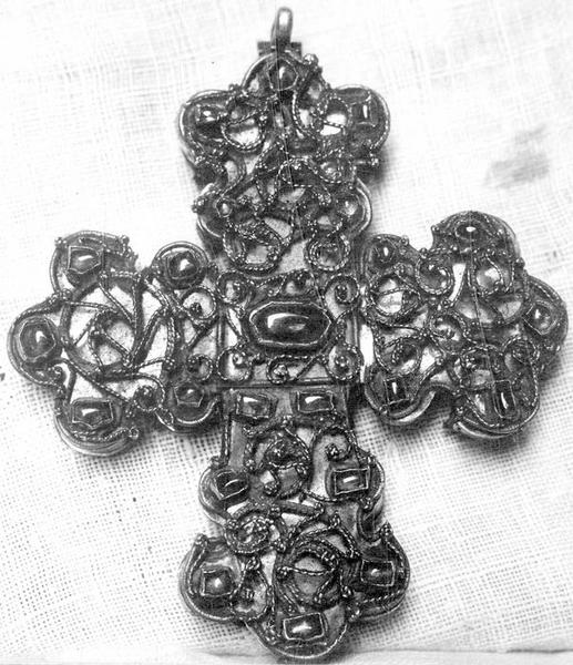 Croix pastorale ouvrante en argent doré décoré de filigranes et de cabochons. A l'intérieur, dix alvéoles contiennent des reliques.