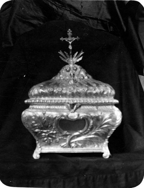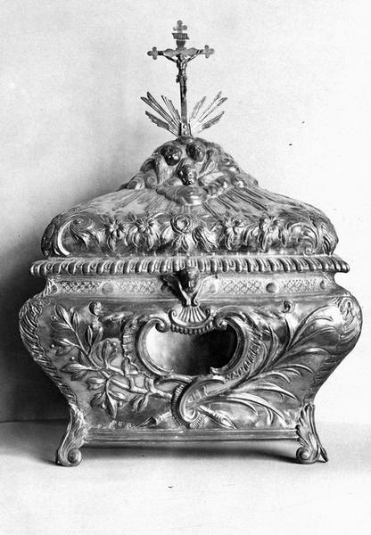 Cette châsse est en forme galbée. Elle repose par quatre patins sur une base rectangulaire. Le couvercle, bombé, est surmonté d'un crucifix.