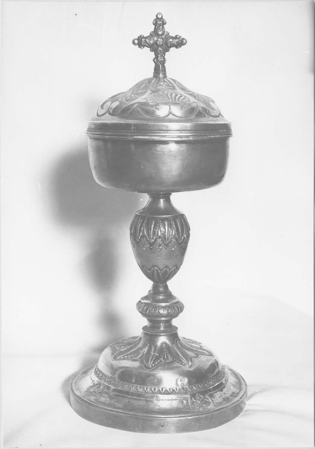 Le pied est rond, décoré au repoussé. Fût à balustre au dessus d'un renflement à décor de petites feuilles ascendantes et descendantes. Coupe unie. Couvercle en dôme surmonté d'une croix.