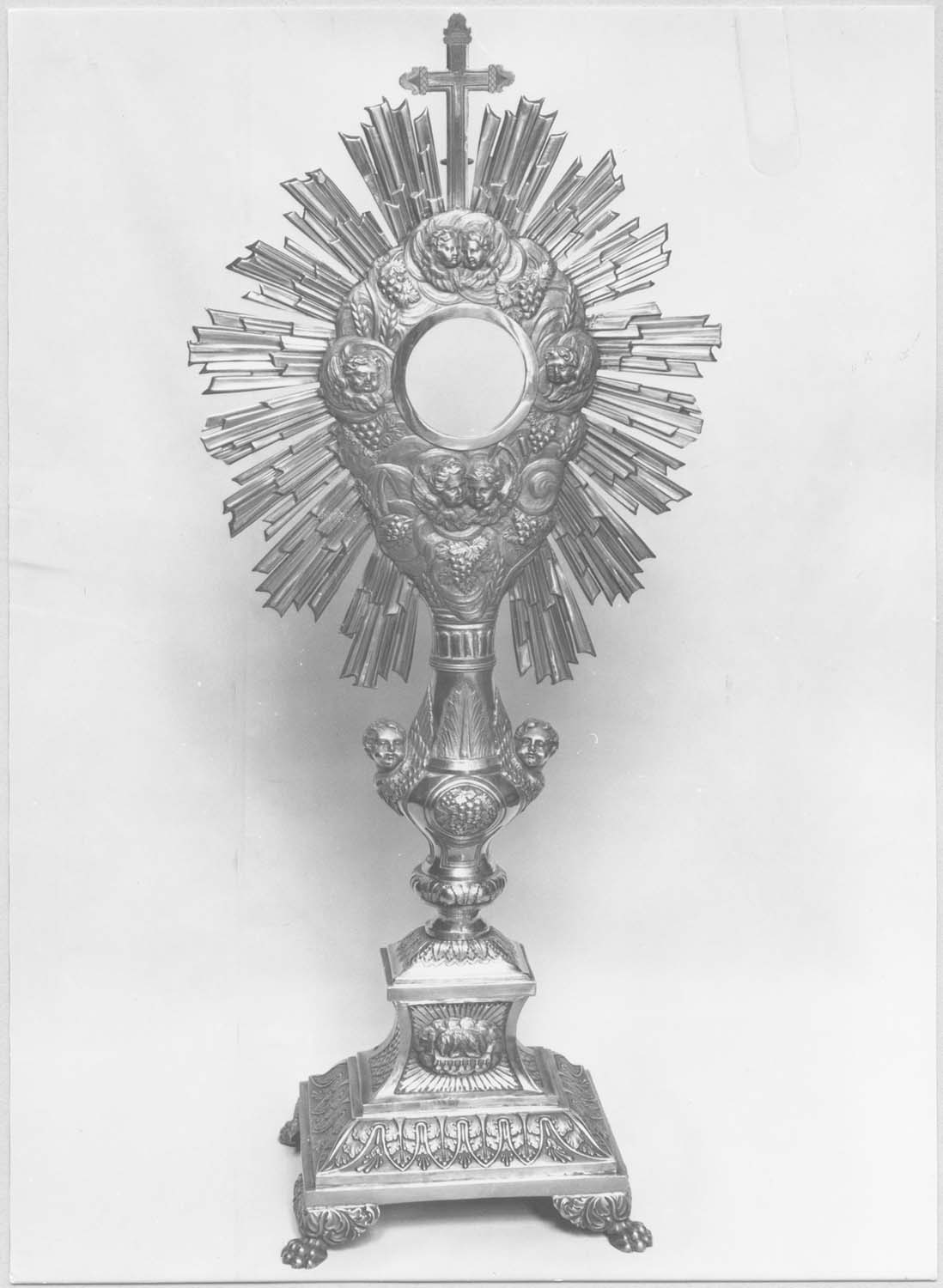 Le pied est rectangulaire, posé sur quatre patins en forme de griffes de lion. Sur une face figure l'agneau immolé couché sur la croix posée sur le livre fermé aux septs sceaux dans une gloire de rayons. Au revers est représenté le triangle trinitaire, également en gloire. Le fût est à balustre. Le soleil est surmonté d'une croix latine.