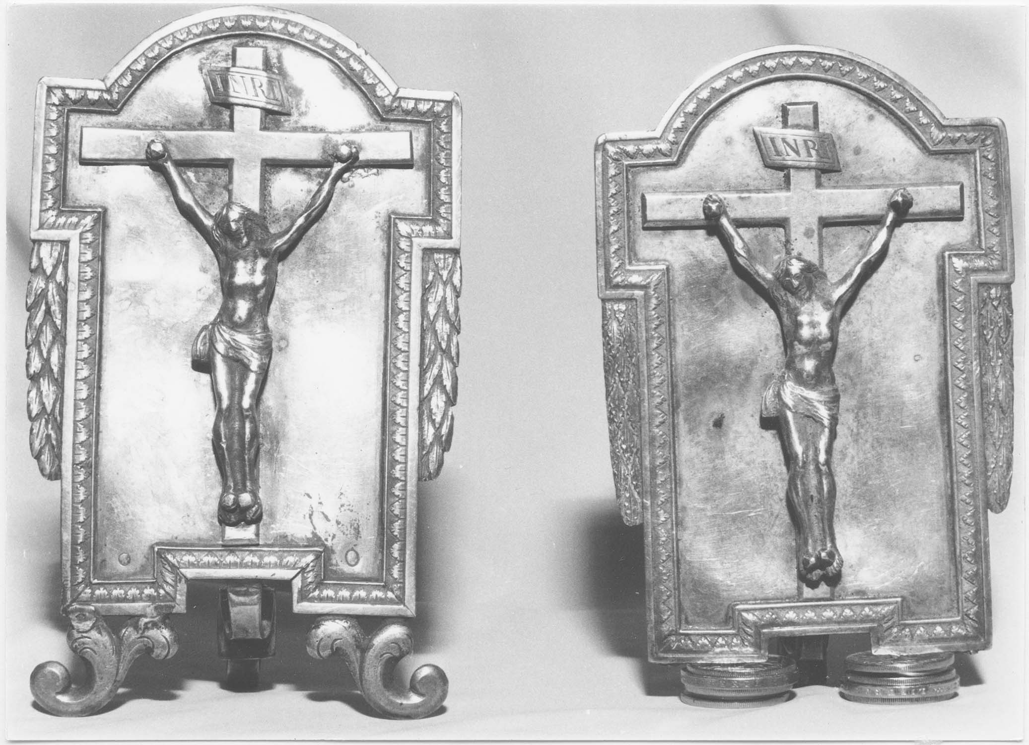 Inscription : L. BRUNET P. AZAIS J. CASTRES (au dos d'un baiser de paix). Inscription : PINEL CURE. DARLES. THENE. LANNOLIER. VIGUIER. MERICI. MONTAGNE. SELARIES. CAZANOU. LAMARQUE (au dos de l'autre baiser de paix). Poinçon de maître : ARIBAUD, surmonté d'une couronne. 1er titre départements 1809-1819 : coq. Moyenne garantie départements 1809-1819 : guerrier casqué, à droite, dans un cercle.