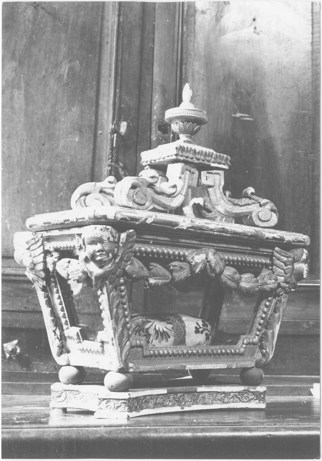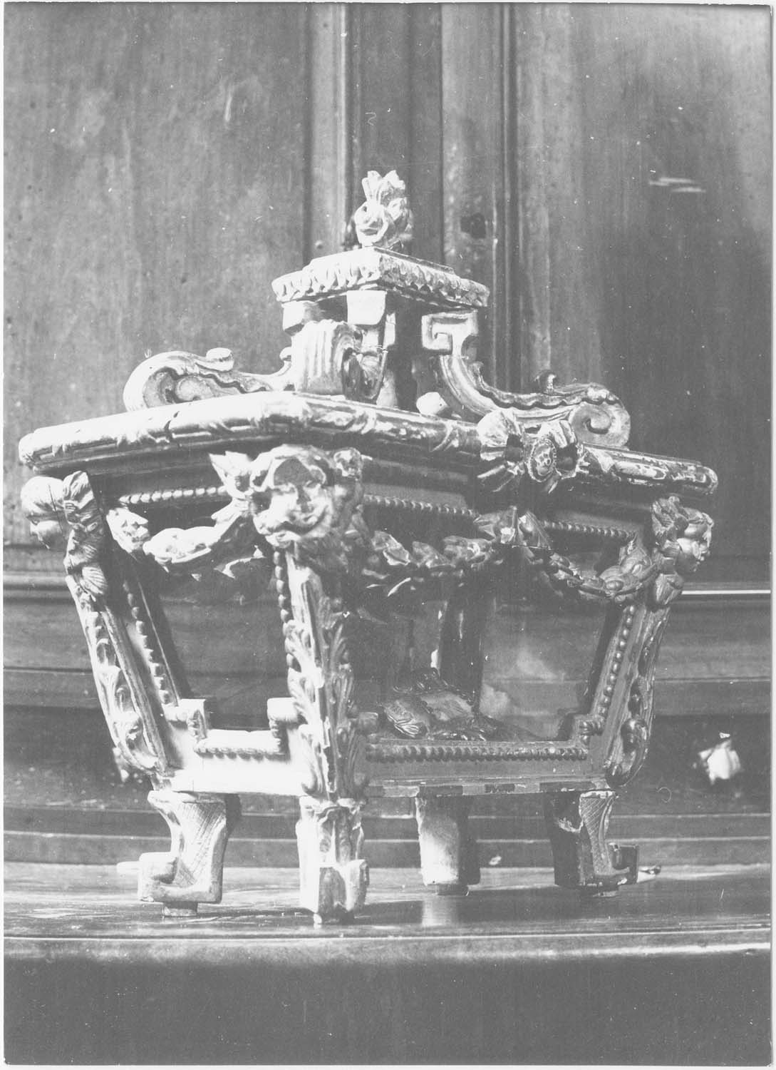 Boîtes ajourées dont l'encadrement de bois forme le décor. Elles sont fermées par un couvercle où des rinceaux soutiennent une petite plateforme qui porte un vase ou une graine.