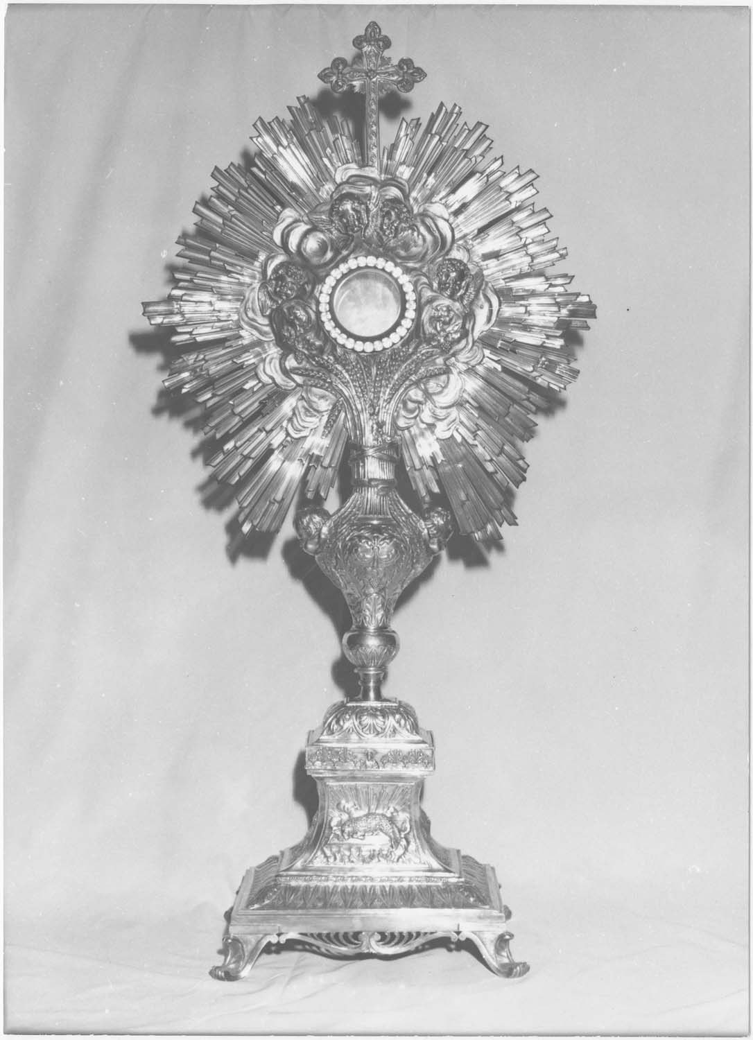 La terrasse est rectangulaire, portée par quatre patins. Le fût est à balustre. Le col se termine en gerbe de blé dont les épis atteignent l'évidemment central autour duquel trente cabochons de cristal sont enchâssés. Le soleil est surmonté d'une croix latine aux abouts florencés.