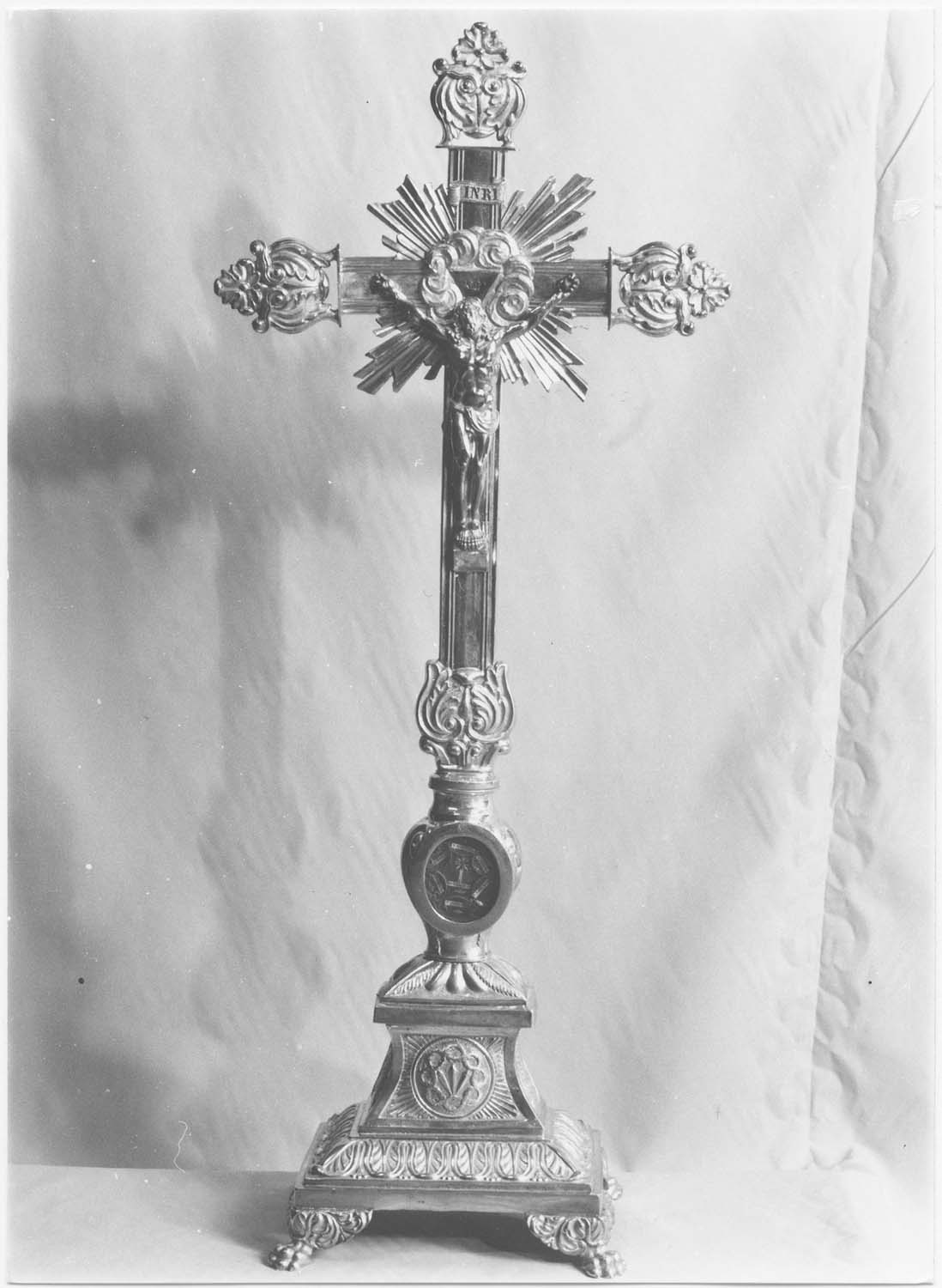 Fonctions combinées. Cette croix-reliquaire, en argent en partie doré, consiste en une terrasse rectangulaire posée sur quatre patins en griffes de lion. Dans le balustre qui surmonte la terrasse se trouve la petite boîte à reliques. Au dessus, une croix latine aux abouts ajourés.