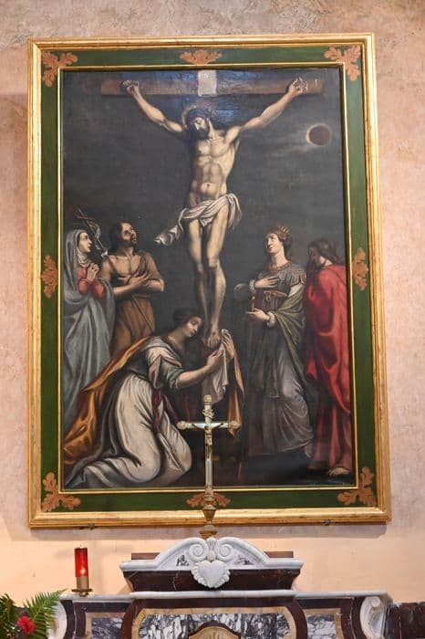 tableau : Le Christ en croix entre la sainte Vierge, saint Jean-Baptiste, sainte Madeleine, sainte Catherine et saint Jean