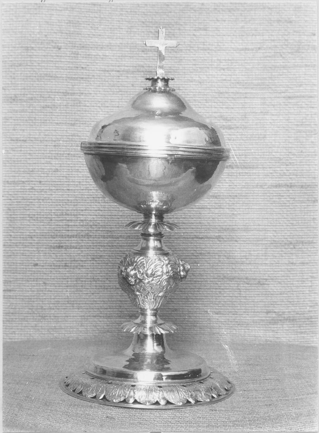 Le pied est rond. Le fût est à balustre entre deux rosettes. Le couvercle bombé est couronné par deux rosettes surmontées par une croix latine à section rectangulaire dont les abouts sont terminés par de petites boules.