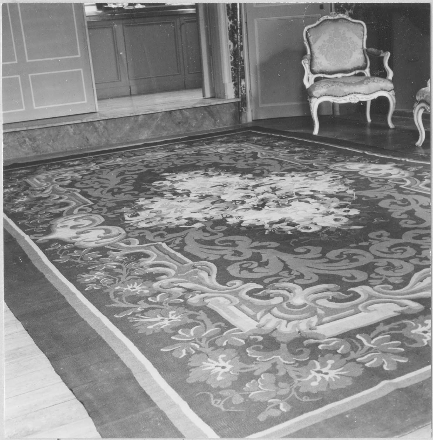 Le tapis le plus grand présente un bordure noire. Au centre, se trouve un bouquet de roses et de dahlias. Certaines fleurs sont violettes et rouge brique. Les rubans sont bleus. Les fleurs sont représentées sur un fond crème. Autour, des torsades vertes, orange, vert foncé. Le tapis le plus petit présente au centre un médaillon de roses avec leur feuillage et quelques fleurs bleues, sur fond clair. La bordure extérieure est rouge foncé, suivie d'une bande verte, puis crème, ornée de bouquets de roses. Le bouquet central est entouré d'un espace rouge sur lequel sont jetées des roses.