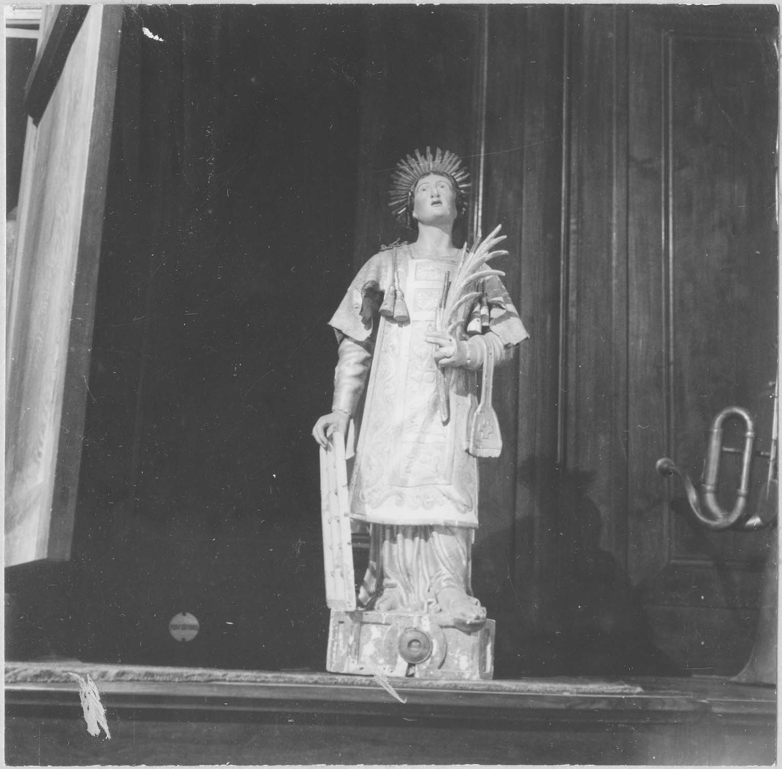 Saint Laurent porte la tenu de diacre. Il tient de la main droite le gril sur lequel il fût brûlé et de la gauche une palme. Il lève les yeux au ciel. Sa tête est entourée de rayons.