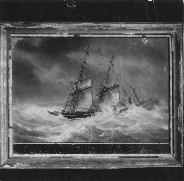 Inscription : Voeu fait par le Capne Arnd BOUIS Commt le Brig N.D. du Scapulaire, affalé sur l'île St Pierre (Sardaigne) par un coup de vent de O.N.O. le II février 1860. Marque d'auteur (sur étiquette) : François ROUX, hydrographe et dessinateur de Marines, sur le Port, 23, Marseille. Fait, vend et répare toutes sortes d'Instruments Pavillons, cartes et Instructions pour la navigation (au revers).