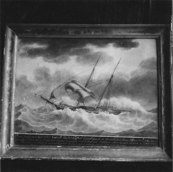 Inscription : Voeu fait par le Capne Dque GIBERT Comdant le Bel Ernest, parti de Marseille le 5 février 1844 en destination de Philippeville le 6 dit à 5 h du soir il reçut un coup de vent de N.O. qui l'obligea à fuir au grès du vent à 7h. Un coup de mer l'enleva de dessus le pont et fut remis à bord par le reflux de la mer.