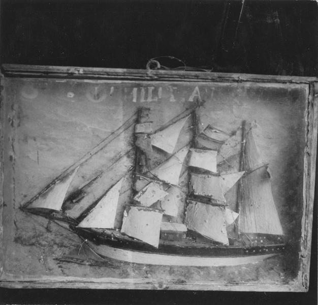 ex-voto : demi-maquette de voilier à trois mats, cadre
