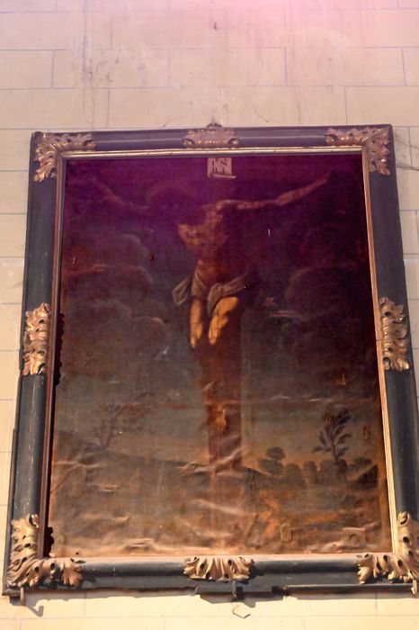 Le Christ mourant est crucifié les bras largement ouverts, les pieds cloués l'un sur l'autre. Sa tête, couronnée d'épines, s'abaisse vers l'épaule droite. Le périzonium, en forme de pagne, est noué sur la hanche droite.Au dessus du Christ est cloué le titulus INRI. La croix s'élève dans un paysage avec des arbres sur un ciel d'orage.Le cadre très beau est peint en bleu, il est décoré de motifs en bois sculpté et doré.Le Rituel du diocèse d'Alet, établi par Nicolas Pavillon mentionnait : Il faut au dessus de l'autel un tableau de sa largeur, peint à l'huile et bien fait, principalement si c'est un crucifix. Il n'y faut rien mettre d'indécent ny de contraire à l'histoire. Aux grands autels, il faudrait un retable peint et doré....Ce tableau est donc l'ancien tableau d'autel de l'église Saint-André qui fut déposé au 19e siècle, lors des modifications liturgiques et du fort remaniement dont fut victime le sactuaire de l'église.