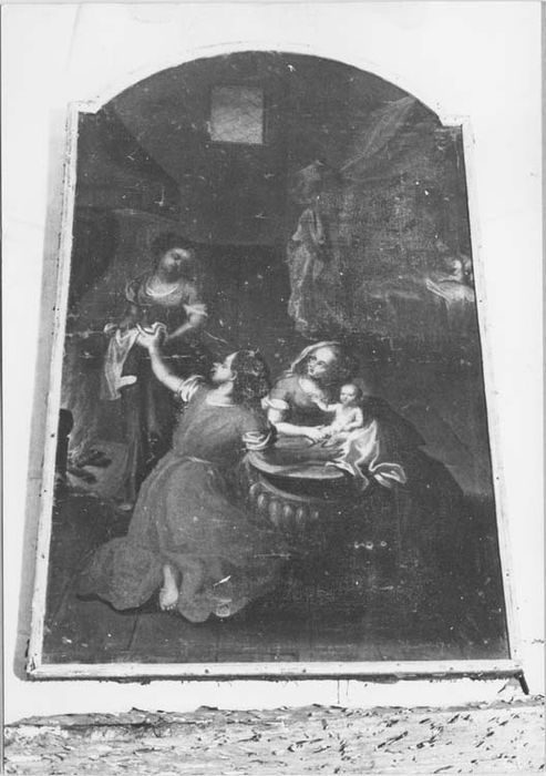 Deux femmes s'apprêtent à emmailloter le nouveau-né, auquel elle viennent de donner un bain dans une cuve à godrons, dans des langes qu'une troisième femme réchauffe devant l'âtre.Dans le coin supérieur droit, la mère, âgée, repose dans un lit à baldaquin. Il semble qu'aux pieds du lit se tient debout un personnage. De même dimension que la Décollation de saint Jean-Baptiste, cette Nativité paraît être celle de saint Jean. L'âge de la mère semble confirmer cette hypothèse, ainsi que le fait que cette toile se trouve dans une église dédiée à ce saint.
