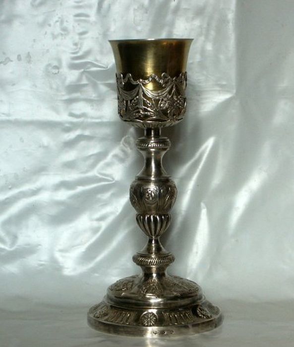 Calice : Bâte droite ; pied travaillé au repoussé orné de médaillons dans lesquels figurent une croix rayonnante ; un pélican nourrissant ses petits, une église et un aigle. Au dessus, bague cordée ; noeud piriforme orné de godrons et de médaillons occupés par des grappes de raisins, des épis de blé et une massette. La coupe est en forme de tulipe lisse ; la fausse coupe est ornée de pampres et d'épis de blé ; le tout surmonté par des rubans noués qui rappellent encore l'époque de Louis XVI.3 poinçons sur le pied : - un homme de face encadré par deux fois le chiffre 3; - un coq de trois quart aux ailes déployées ; - poinçon de maître : un losange contenant un S surmonté d'un soleil. (LOUIS III SAMSON)Sur la coupe : - les deux premiers poinçons sont identiques à ceux du pied, - le poinçon de maître représente un losange dans lequel se trouve un vase avec des fleurs.Patène : Gravée ou incisée ; au dos : IHS surmonté d'une croix au dessus d'un coeur percé de trois clous. Poinçons : -Femme vue de face ; - coq aux ailes déployées.