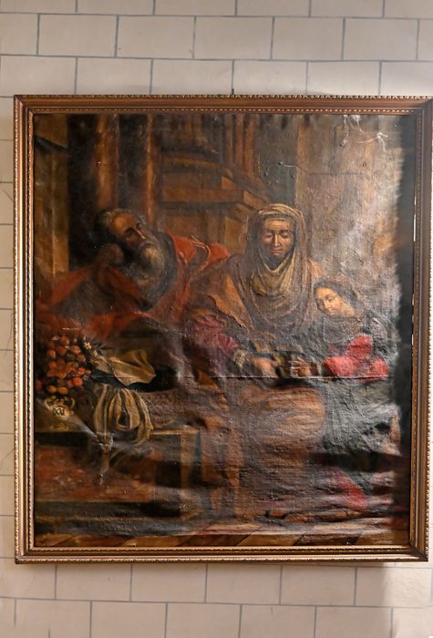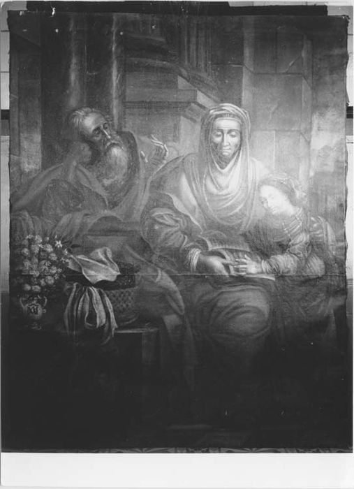 Dans un décor architectural à l'antique, Marie en fant apprend à lire sous la direction de sa mère Anne, tandis que son père Joachim semble observe cette scène. Devant Joachim un beau vase de fleurs et une corbeille à ouvrage sont posés sur une banquette. Cette représentation correspond à l'iconographie hagiographique traditionnelle de sainte Anne. Mais on y a rajouté la présence de saint Joachim. C'est une sorte de parallèle avec la Sainte Famille.