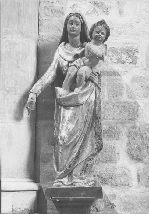 La Vierge Marie est revêtue d'une robe et d'un grand manteau qui l'enveloppe et dont elle relève un pan dans sa main gauche sous son enfant. La tête gracieuse est recouverte par le manteau. Le bras droit de la Vierge, pendant semble avoir tenu une fleur ou un sceptre.L'Enfant est plus un garçonnet qu'un nouveau né. Ses pieds sont posés sur le pli en tablier que forme le manteau de sa mère. Il est revêtu d'un lange sur les reins; le corps est en rotation vers la gauche; le bras gauche et l'avant-bras droit ont disparu. Les visages de la mère et de l'Enfant ont une belle expression.