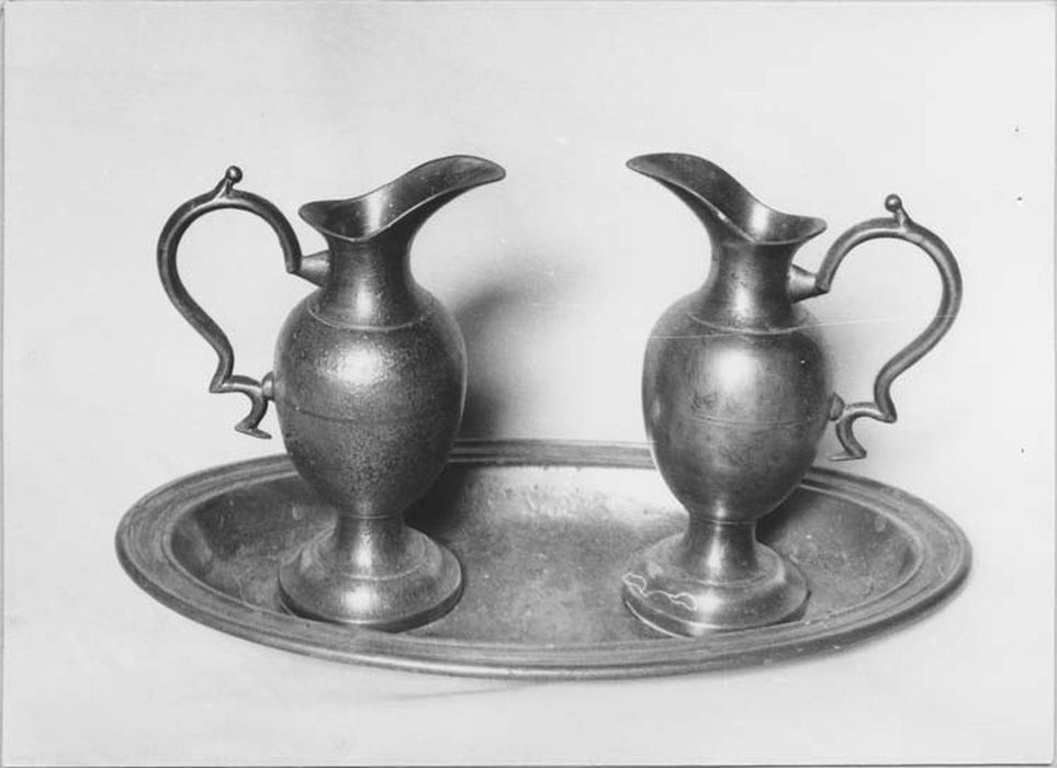 Burettes classiques de forme à balustre. Pied rond, panse ovoïde, anses fermées, bec allongé.Le plat est ovale sans décor excepté quelques filets sur le marli.