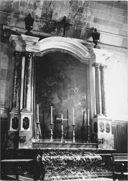 Autel en marbre rose galbé.Le retable est composé de quatre colonnes de marbre supportant un entablement cintré surmonté de deux pots à feu et d'une croix.Au centre dans un cadre de marbre, une représentation de l'Assomption de la VIerge.