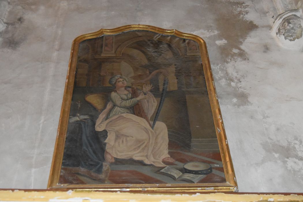 Sous un décor architectural, sainte Cécile joue de la harpe. Elle est assise sur un siège Louis XVI.A ses pieds se trouvent un tambourin et un livre.Influence orientale.A rapprocher du tableau de 'Saint Joachim, sainte Anne et la Vierge.