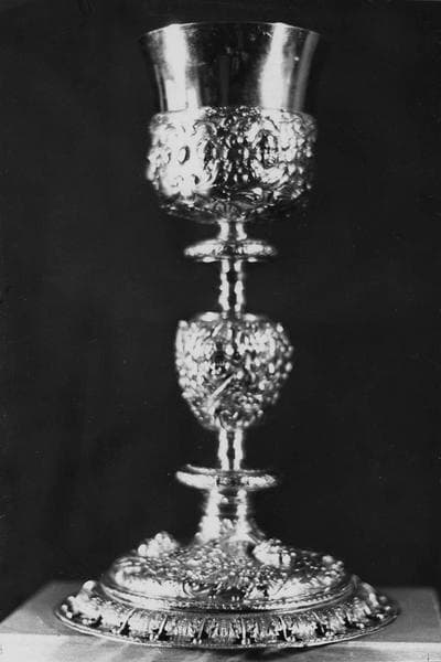 Pied rond à bordure, fût à une balustre entre deux noeuds, fausse-coupe et coupe ornées.