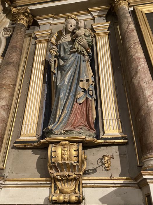 Peinture et dorure moderne, servant à harmoniser la statue avec le retable du 18e siècle sur lequel elle est placée.