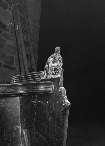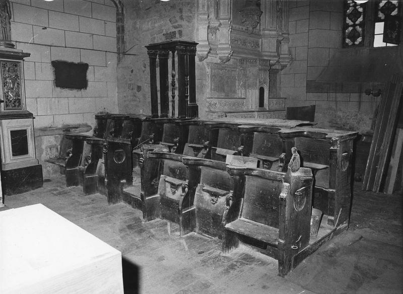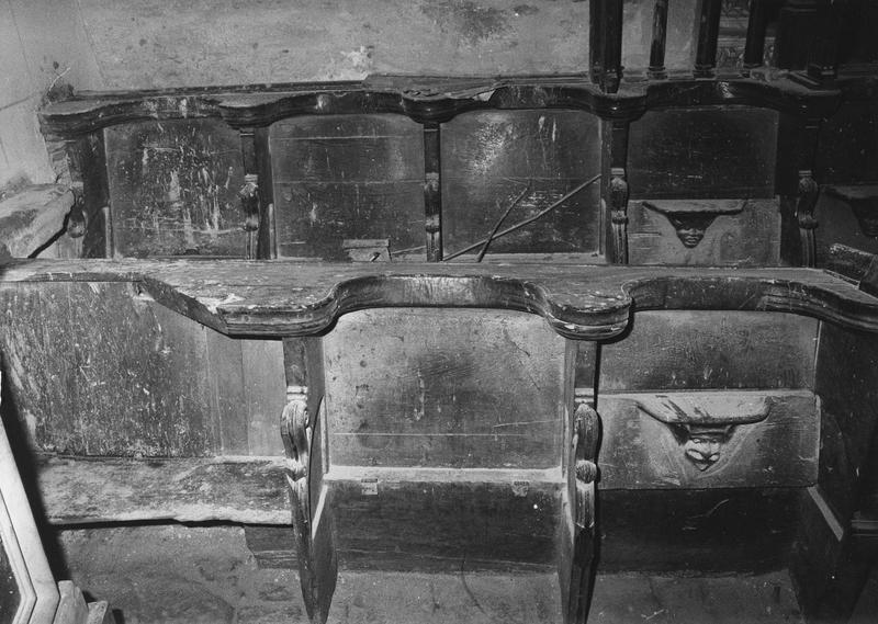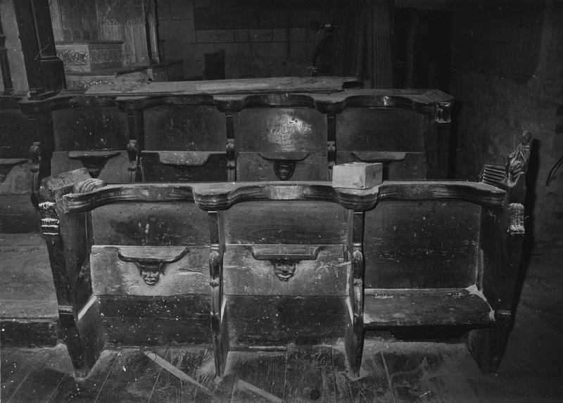 Composé de 26 sièges, sans dossier, douze à gauche du maître-autel, quatorze à droite. A droite comme à gauche et au milieu du deuxième rang, un siège porte un baldaquin, soutenu par des pilastres cannelés et à chapiteaux. Au siège de gauche, certains pilastres sont remplacés par la statue d'un évêque debout et bénissant de la main droite.