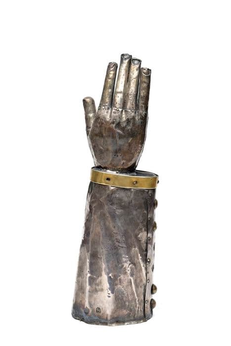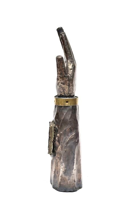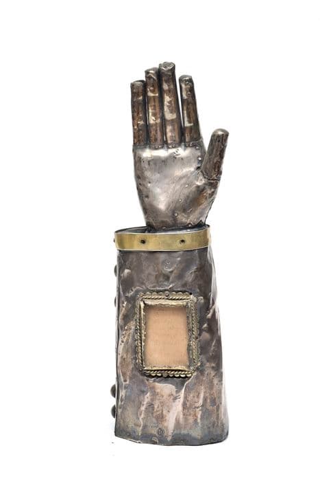 Bras reliquaire formé de plaques d'argent clouées sur âme de bois. Main droite ouverte. Ouverture rectangulaire pour les reliques placée du côté de la paume, fermé par une plaque de verre. Support de bois largement supérieur.
