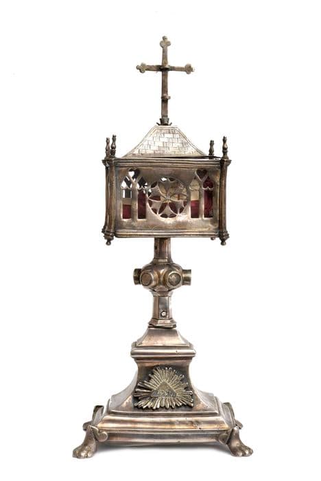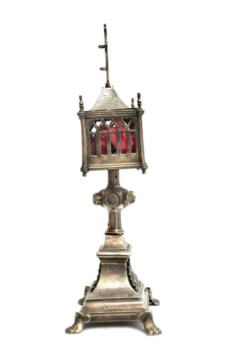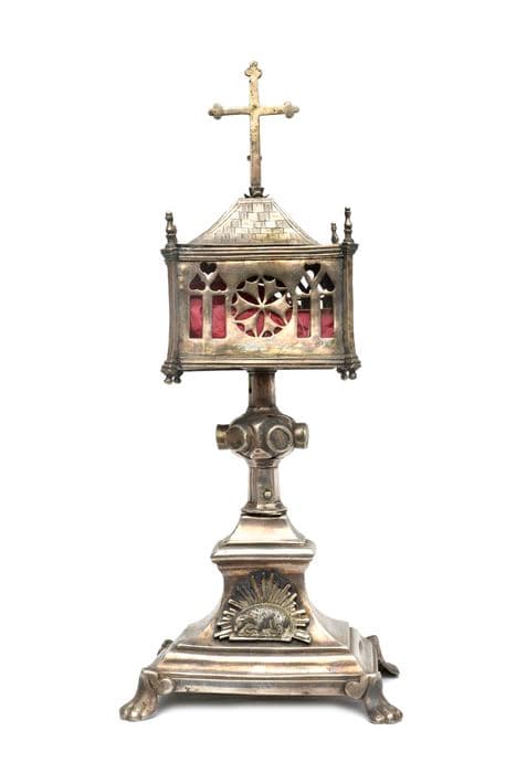 Reliquaire pédiculé, formé d'une boîte rectangulaire couverte d'une toiture à quatre pentes, sommé d'une croix lisse aux extrémités ornées. Les quatre côtés sont ajourés en forme de vitraux et rosaces et les angles sont renforcés de contreforts à pinacles. Tige hexagonale, noeud hexagonal portant six caissons circulaires lisses. Pied du 19e siècle.